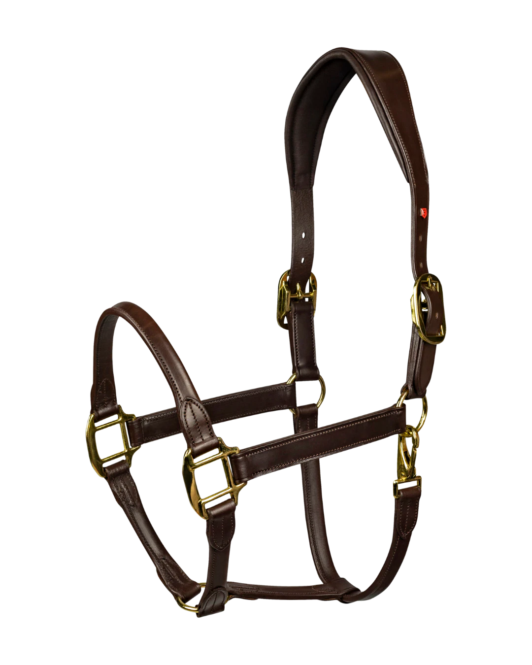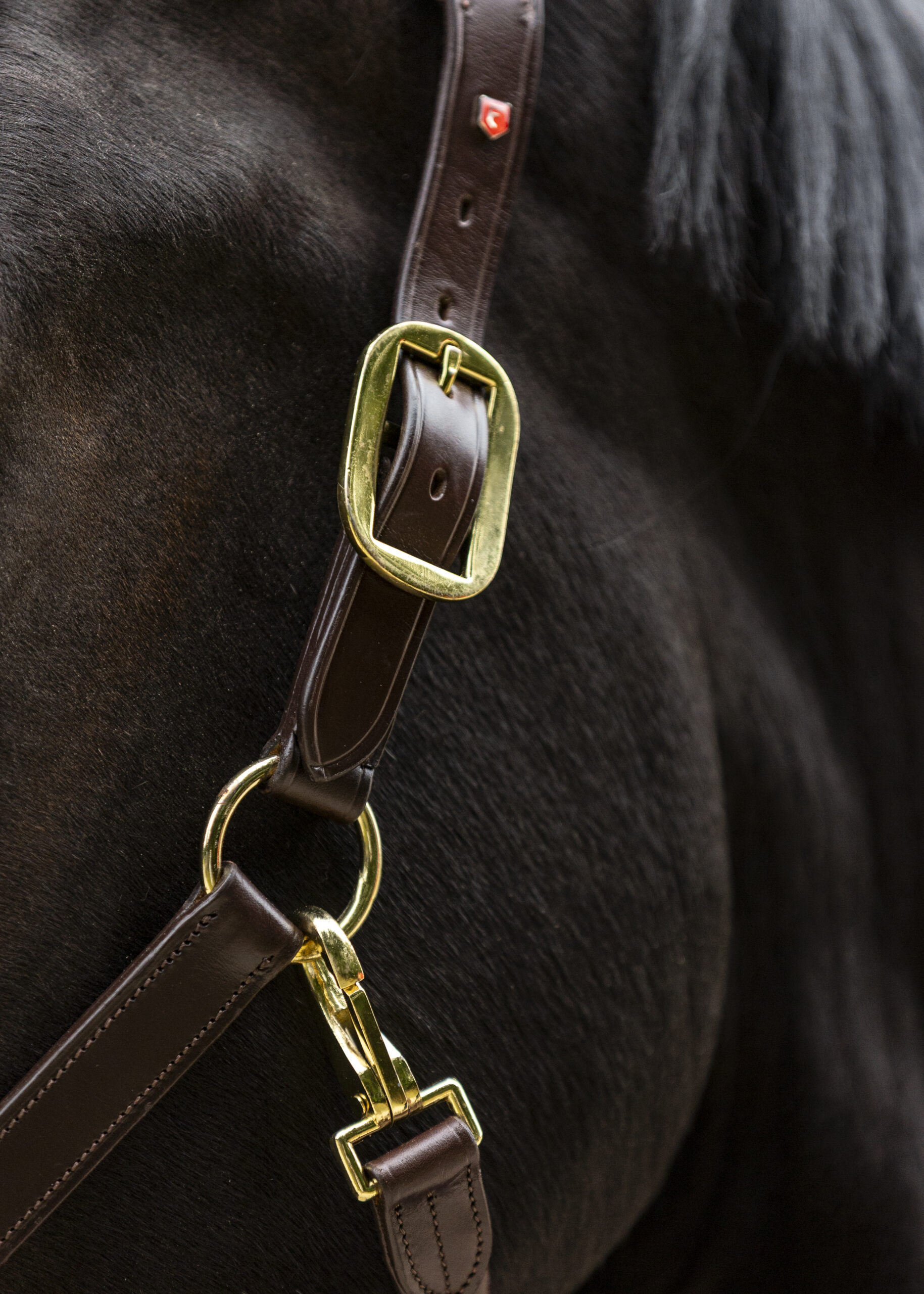 Lederhalfter aus italienischem Leder gefertigt, mit schönen Beschlägen aus Edelstahl in Goldfarbe, die ihm ein elegantes Aussehen verleihen.