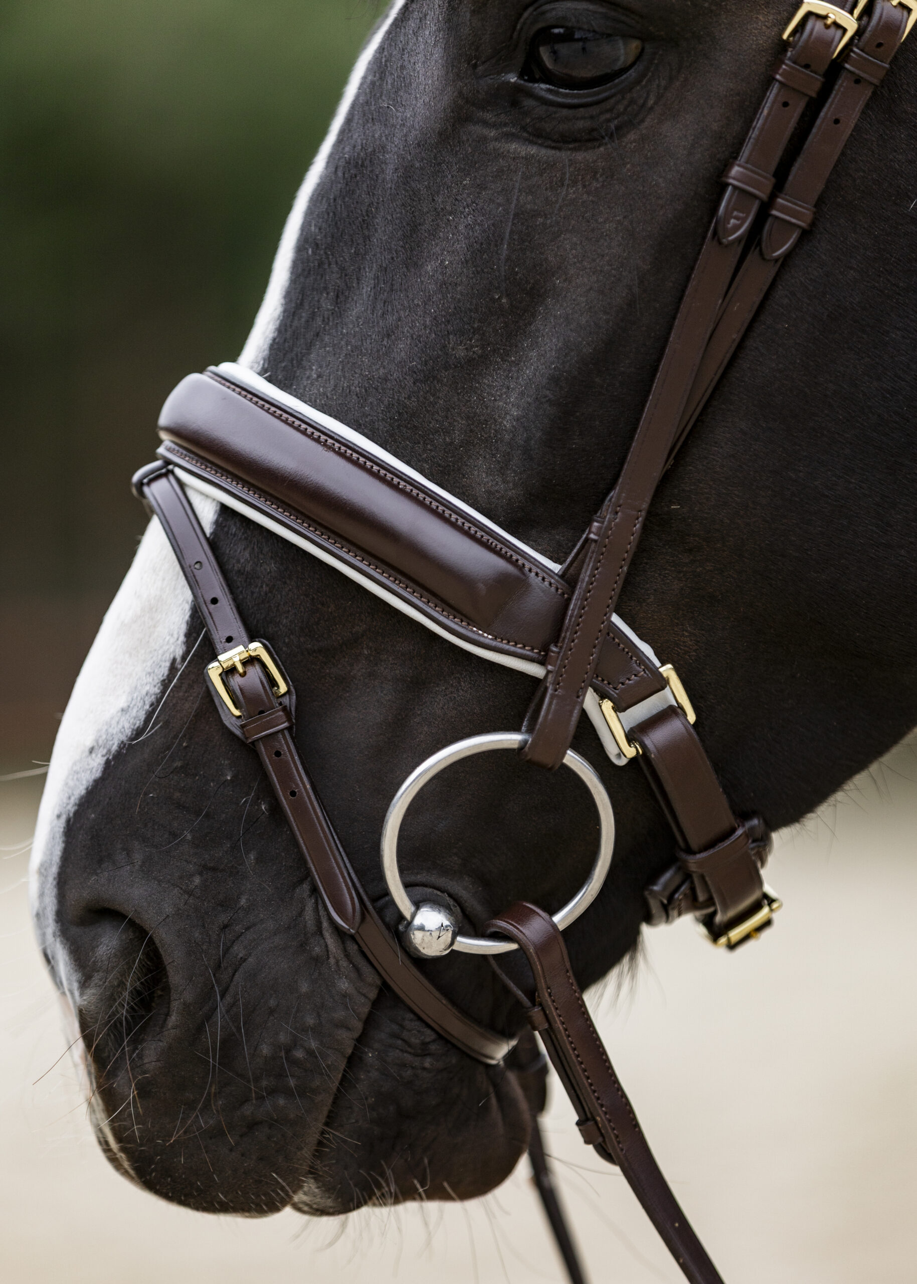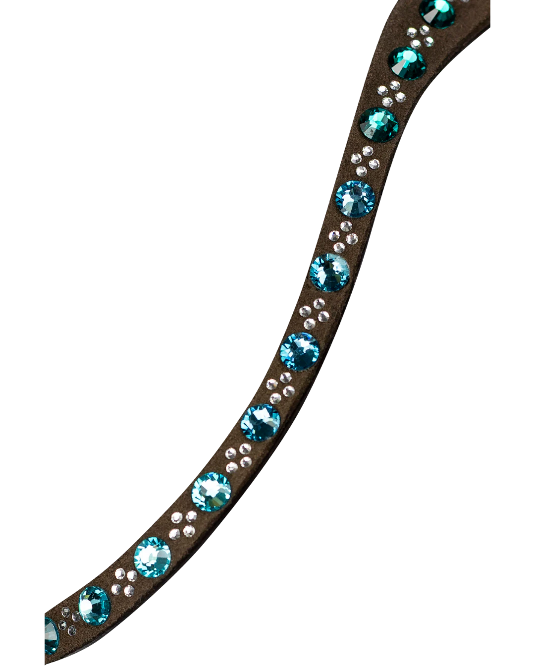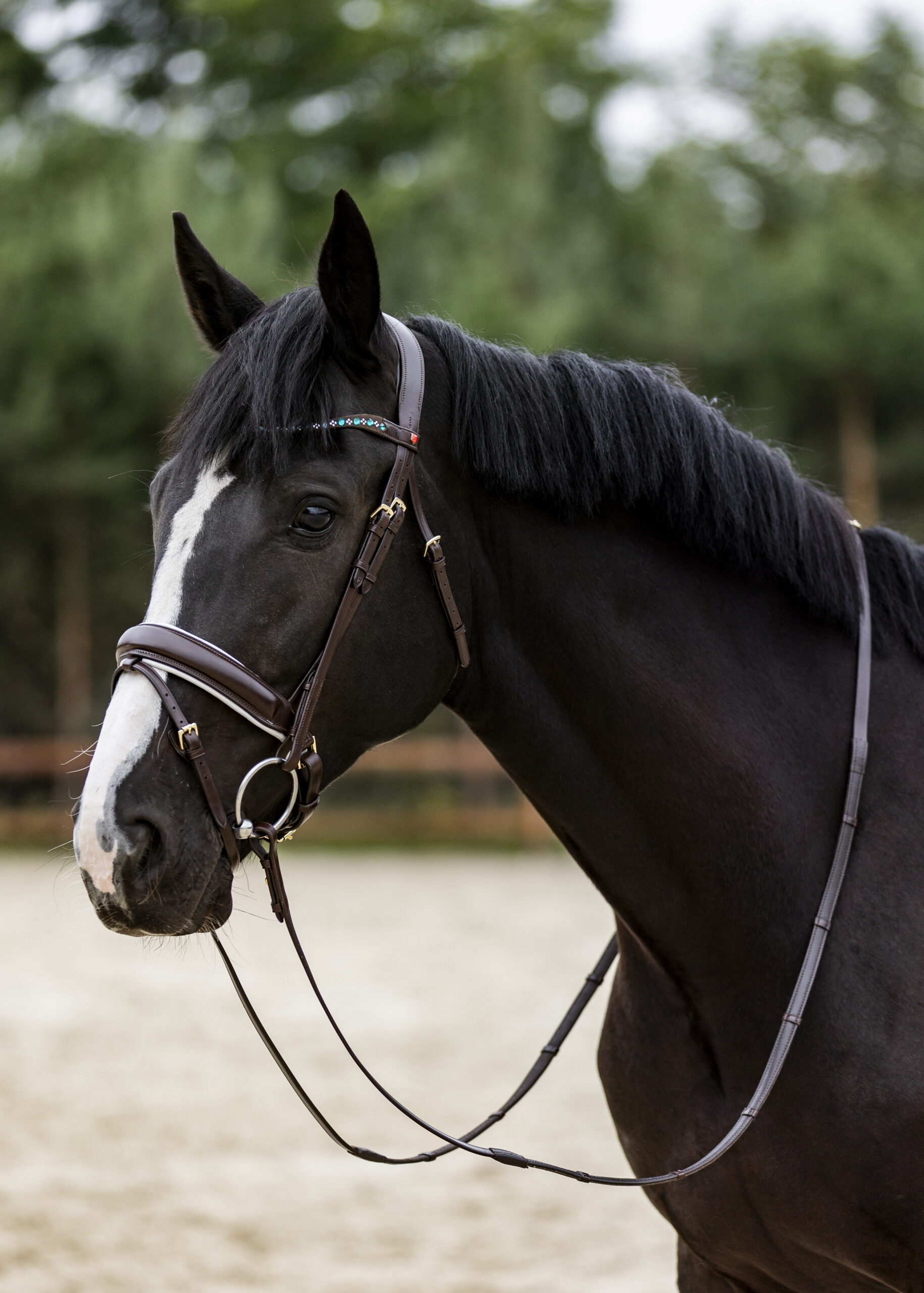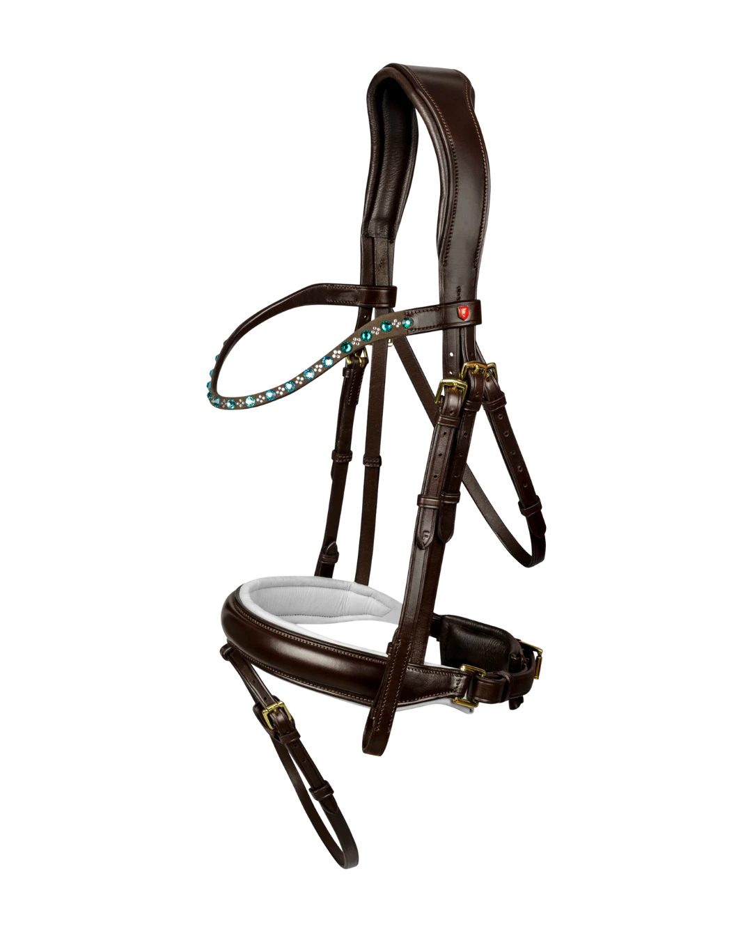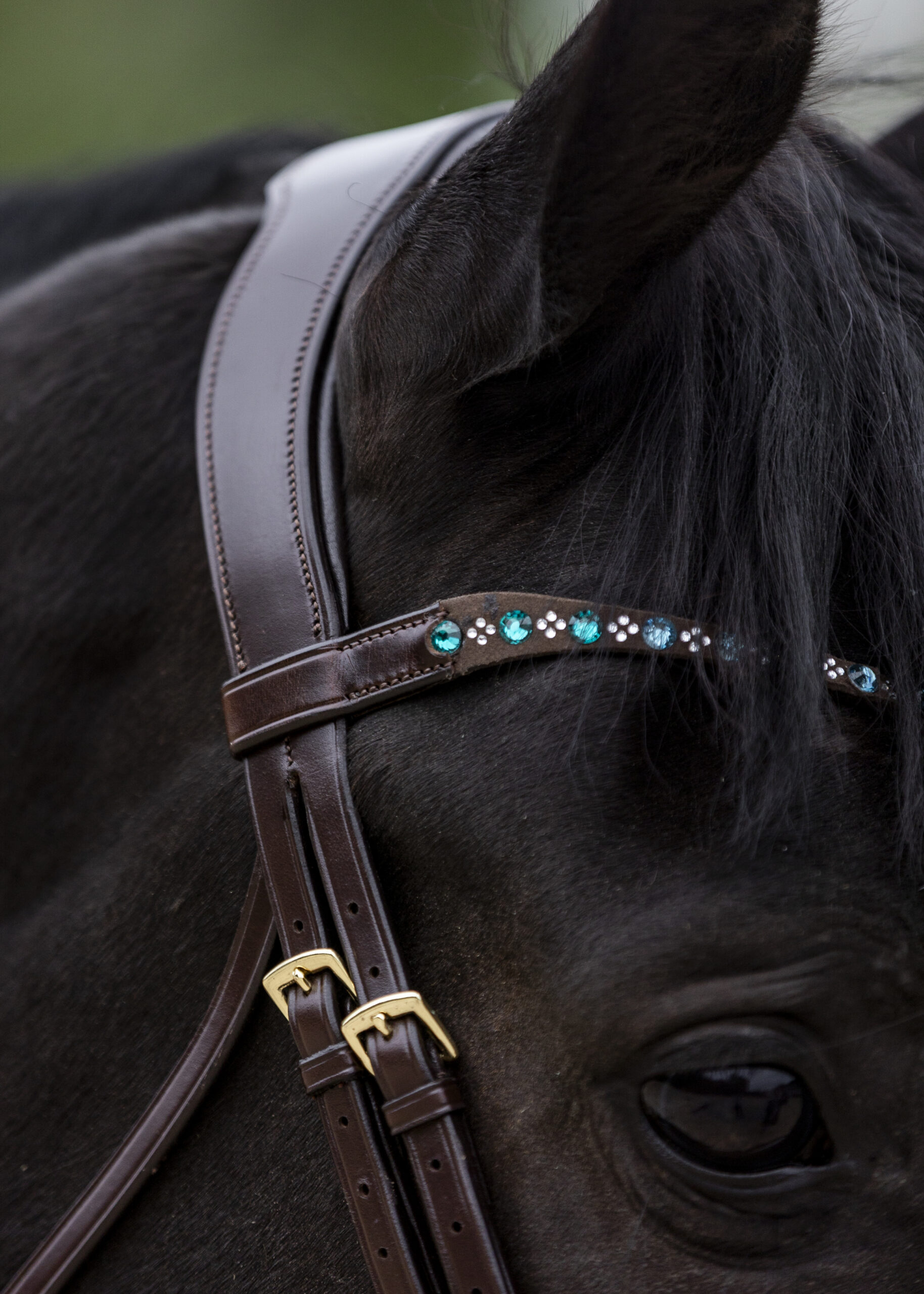 Das Equinox Zaumzeug ist aus hochwertigem, weichem italienischem Leder gefertigt. Der Stirnriemen ist mit türkisfarbenen Steinen verziert, der weich unterlegte schwedische Nasenriemen sowie das anatomisch geformte Genickstück sorgen für eine sehr gute Passform.